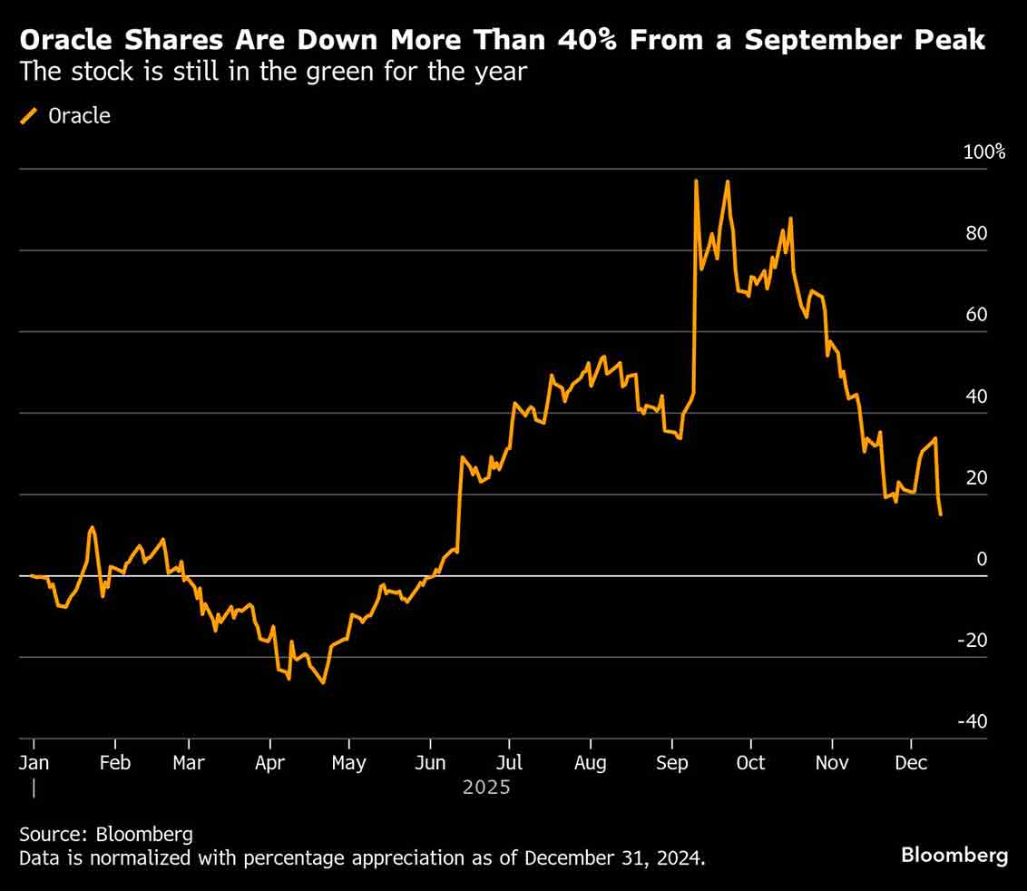 Saham Oracle anjlok pada Kamis usai perusahaan melaporkan pengeluaran modal yang jauh lebih tinggi dari perkiraan pada kuartal fiskal kedua dan pertumbuhan penjualan cloud tidak mencapai perkiraan rata-rata analis. Pada Jumat, laporan bahwa beberapa proyek pusat data yang sedang dikembangkan untuk OpenAI mengalami penundaan membuat saham Oracle turun lebih lanjut dan menekan saham-saham lain yang terpapar infrastruktur AI. Sementara itu, indikator risiko kredit Oracle mencapai level tertinggi sejak 2009.