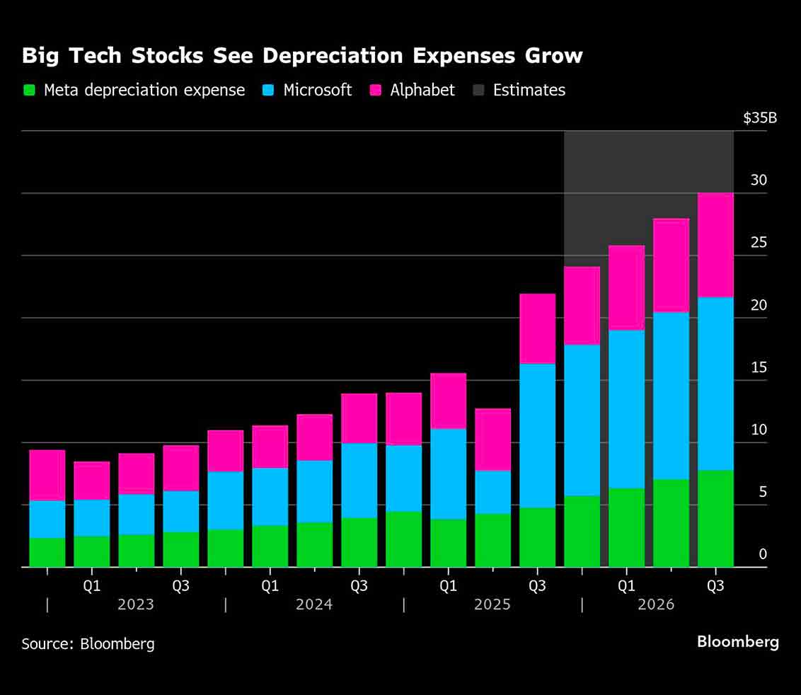 Biaya depresiasi yang meningkat akibat ekspansi pusat data menjadi kekhawatiran utama. Alphabet, Microsoft, dan Meta bersama-sama mencatat biaya depresiasi sekitar US$10 miliar pada kuartal terakhir 2023. Angka tersebut naik menjadi hampir US$22 miliar pada kuartal yang berakhir pada September. Dan diperkirakan akan mencapai sekitar US$30 miliar pada periode yang sama tahun depan.