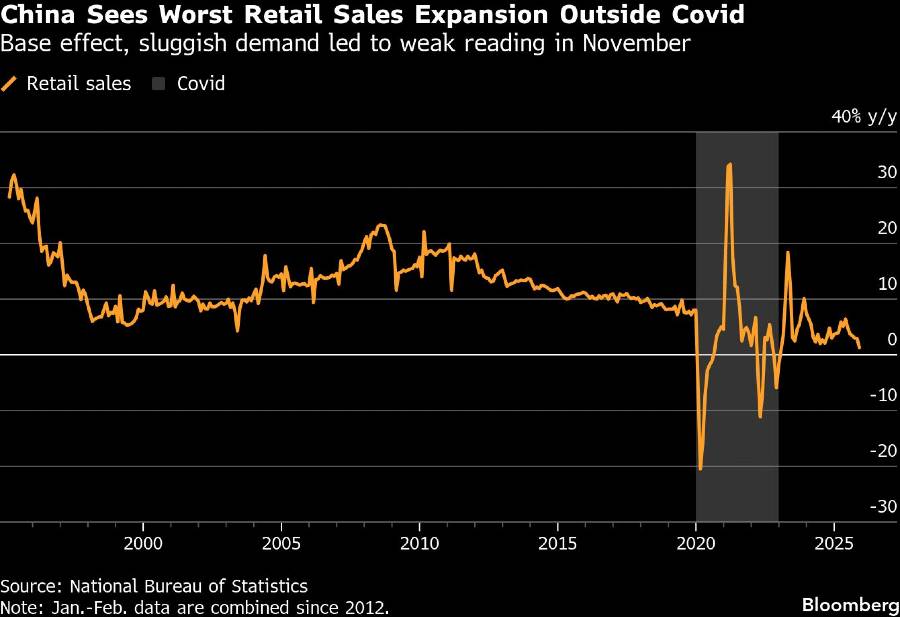 Penjualan ritel hanya naik 1,3% pada November dibandingkan dengan tahun sebelumnya—angka terendah yang pernah tercatat, di luar periode pandemi. Angka ini lebih buruk daripada semua perkiraan dalam survei Bloomberg terhadap analis, di mana perkiraan mediannya bahwa pertumbuhan akan tetap di 2,9% untuk bulan kedua.