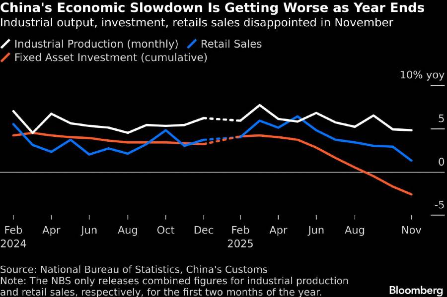 "Data November China menunjukkan permintaan domestik terus merosot menjelang akhir tahun, sementara pertumbuhan produksi mencapai level terendah tahun ini, meski ekspor mengalami peningkatan. Penurunan yang meluas ini menunjukkan ekonomi kini bahkan lebih lemah daripada sebelum kebijakan pro-pertumbuhan berubah pada kuartal IV-2024."
