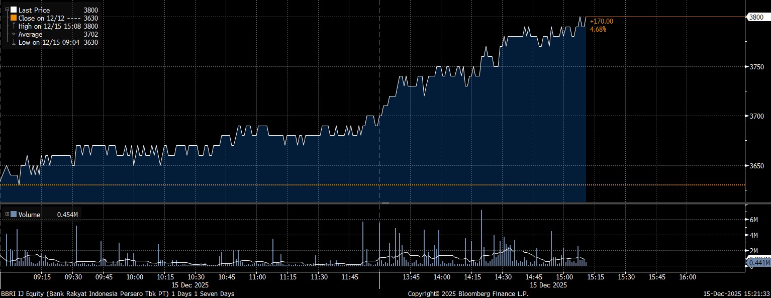 Hari ini, Senin (15/12/2025), harga saham BBRI melejit mencapai posisi Rp3.800/saham. Menguat 4,68% dibanding penutupan perdagangan hari sebelumnya.