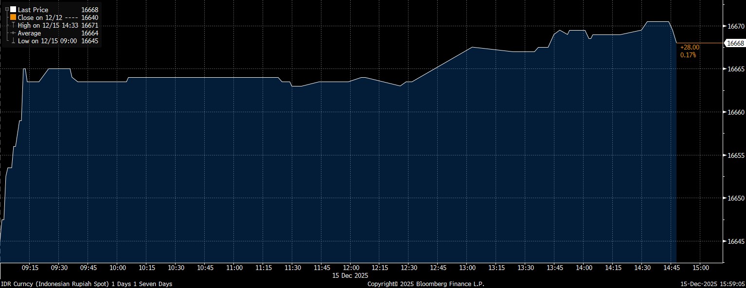 Pada Senin (15/12/2025), US$ 1 setara dengan Rp 16.668 kala penutupan pasar spot. Rupiah terdepresiasi 0,17% point–to–point.