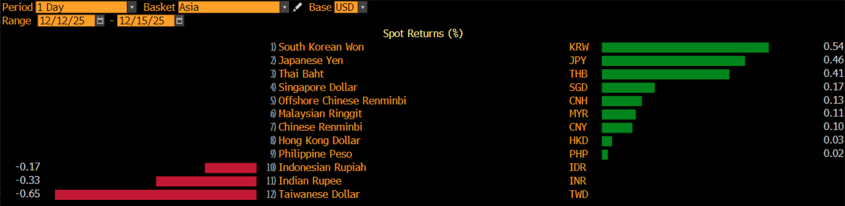 Won Korea Selatan berhasil menjadi yang terbaik di Benua Kuning dengan apresiasi 0,54%. Disusul oleh yen Jepang dan baht Thailand yang menguat 0,46% dan 0,41%.