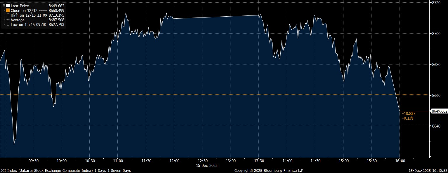 Bloomberg Technoz, Jakarta - Indeks Harga Saham Gabungan (IHSG) ditutup di zona merah dengan pelemahan 0,13% ke 8.649,66 pada perdagangan Senin (15/12/2025).