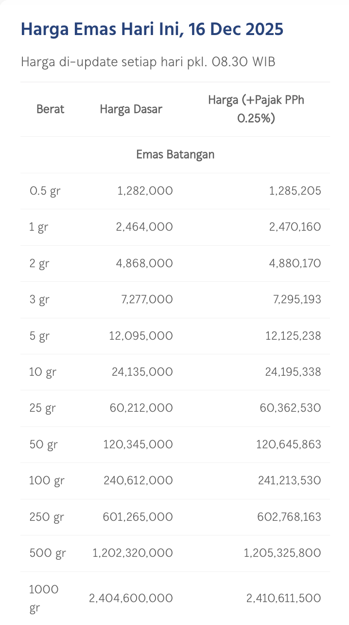 Pada Selasa (16/12/2025), emas Antam dihargai Rp 2.464.000/gram. Tidak berubah dari harga hari sebelumnya.