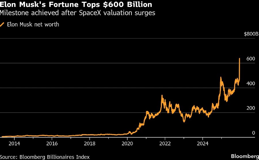 Bloomberg, Kekayaan Elon Musk mencapai rekor tertinggi baru, melampaui US$600 miliar untuk pertama kalinya berkat valuasi baru SpaceX.