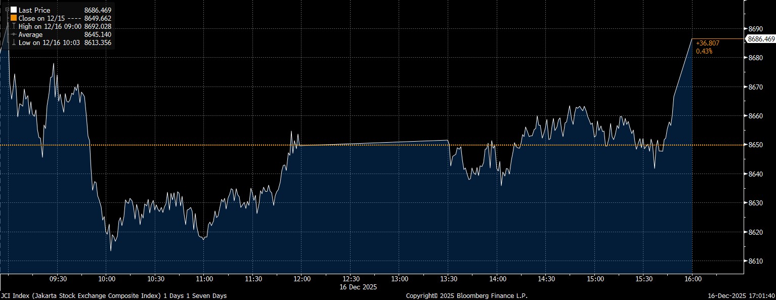 Bloomberg Technoz, Jakarta - Indeks Harga Saham Gabungan (IHSG) akhirnya ditutup di zona hijau dengan menguat 0,43% di posisi 8.686,46 pada penutupan perdagangan Selasa (16/12/2025) usai bergerak fluktuatif sepanjang hari sejak pembukaan.