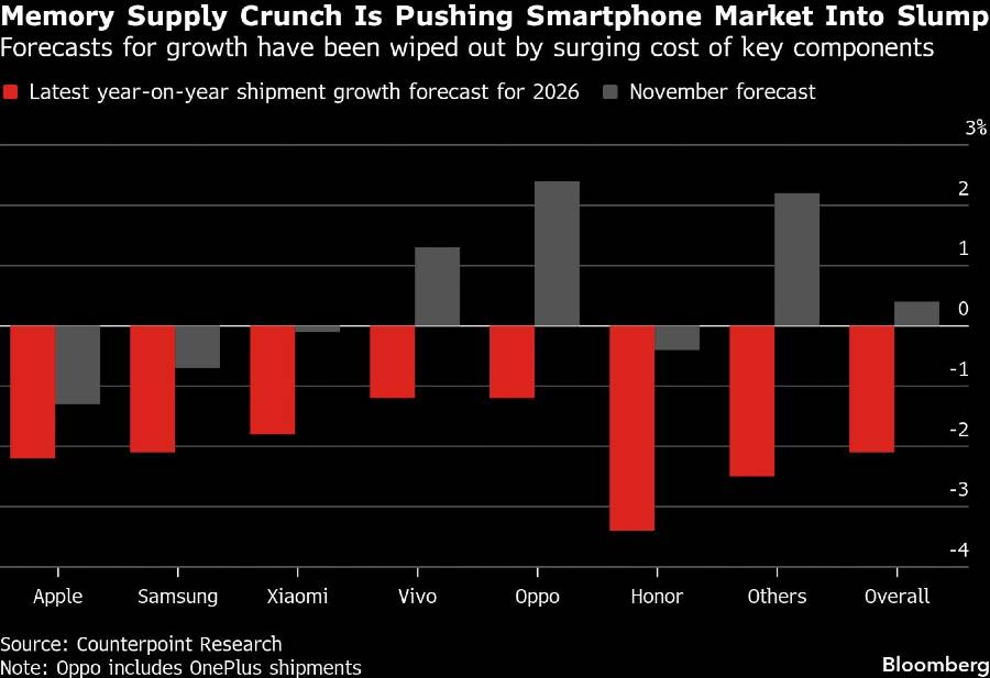 Bloomberg, Lembaga riset industri Counterpoint Research memperkirakan pengiriman smartphone global akan anjlok 2,1% tahun depan karena kekurangan cip memori mendorong kenaikan biaya dan menekan produksi.