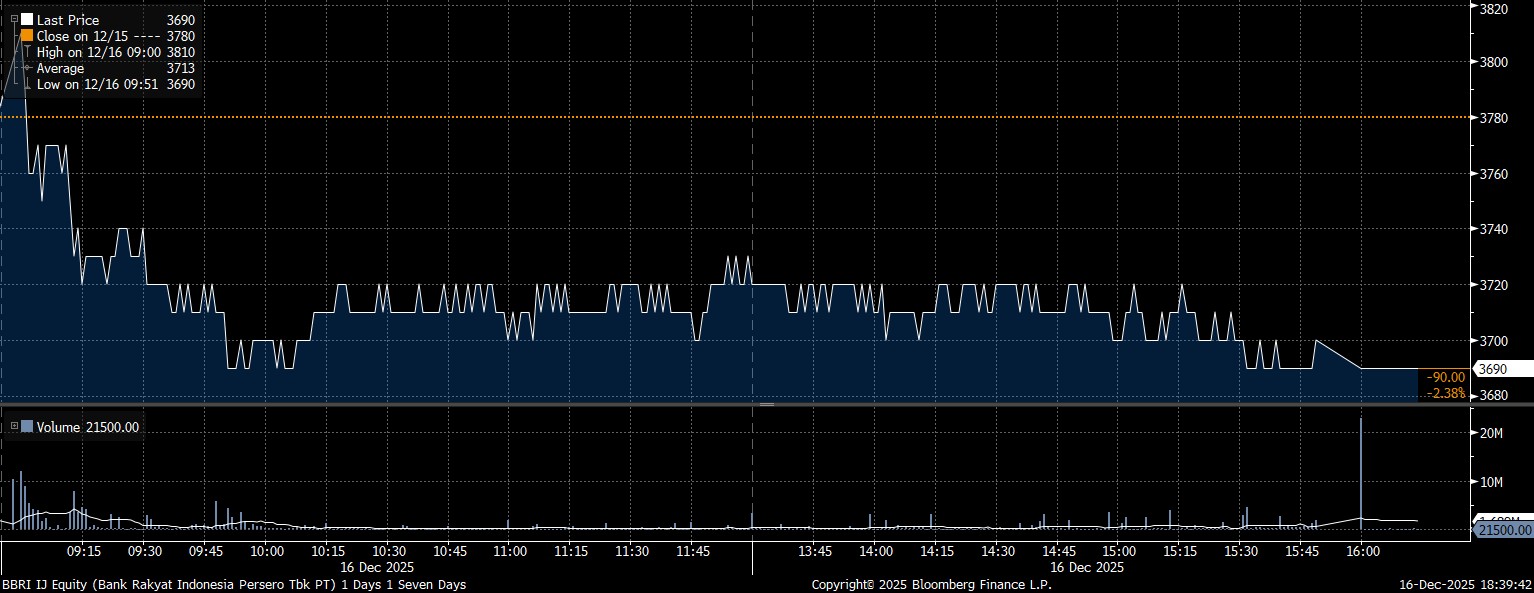 Adapun investor asing net sell yang deras pada saham PT Bank Rakyat Indonesia Tbk (BBRI) mencapai Rp264,6 miliar. Imbas manuver jual, saham BBRI melemah 2,38% hingga terpeleset dalam posisi Rp3.690/saham.