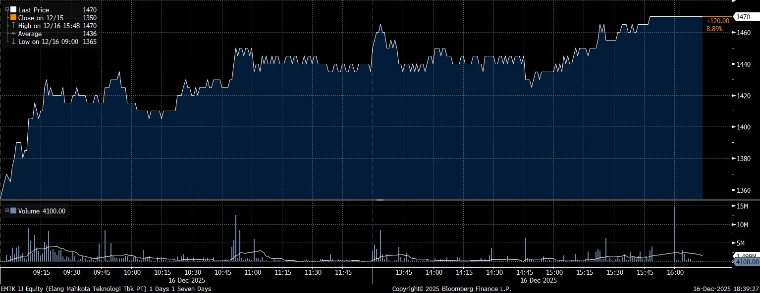 Sedang pada kesempatan yang sama, investor asing mencatat net buy terbesar pada saham PT Elang Mahkota Teknologi Tbk (EMTK) mencapai Rp140,25 miliar. Terdorong pembelian yang deras, saham EMTK menguat 8,89% dan ditutup di posisi Rp1.470/saham.
