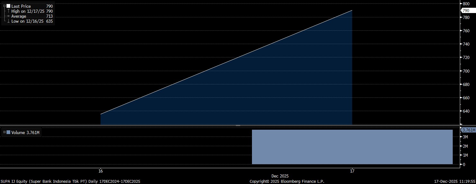 Bloomberg Technoz, Jakarta - Bank digital hasil transformasi ekosistem multi-mitra dari grup Emtek, Grab, Singtel, dan KakaoBank, PT Super Bank Indonesia Tbk (SUPA), resmi mencatatkan sahamnya di Bursa Efek Indonesia (BEI) hari ini, Rabu (17/12/2025). Hari pertamanya, saham SUPA melesat 24,4%.
