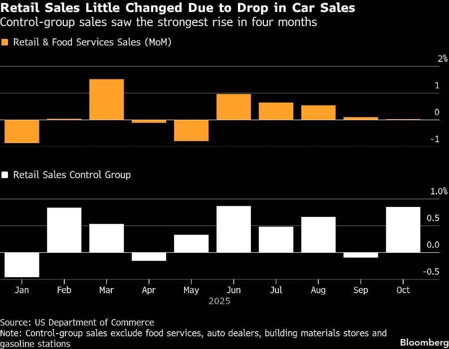 Nilai pembelian ritel, yang tidak disesuaikan dengan inflasi, hampir tidak berubah setelah revisi kenaikan 0,1% pada September, menurut laporan Departemen Perdagangan yang tertunda akibat penutupan pemerintah. Tidak termasuk dealer kendaraan bermotor dan stasiun pengisian bahan bakar (SPBU), penjualan meningkat 0,5%.