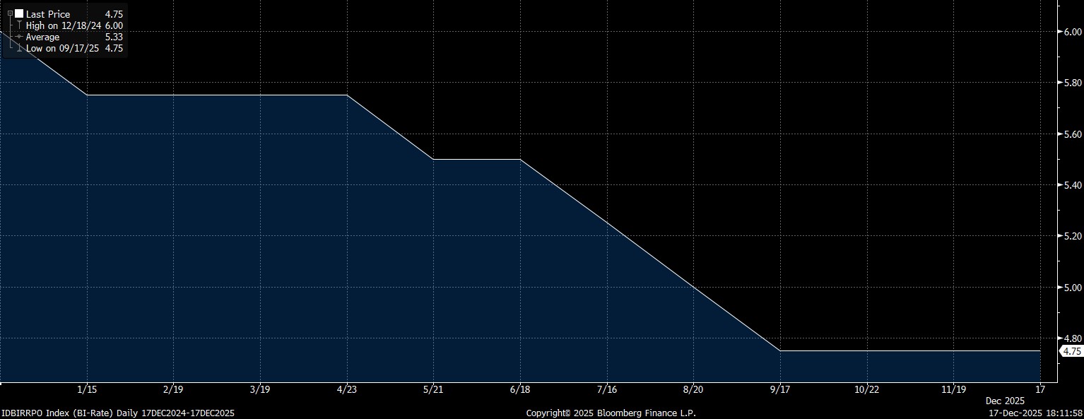 Bank Indonesia (BI) mengumumkan hasil Rapat Dewan Gubernur (RDG) edisi Desember 2025. Satu yang ditunggu tentu pengumuman suku bunga acuan BI Rate. Pengampu kebijakan moneter ini memutuskan untuk menahan tingkat suku bunga acuan (BI Rate) tetap di level 4,75% dalam hasil RDG.