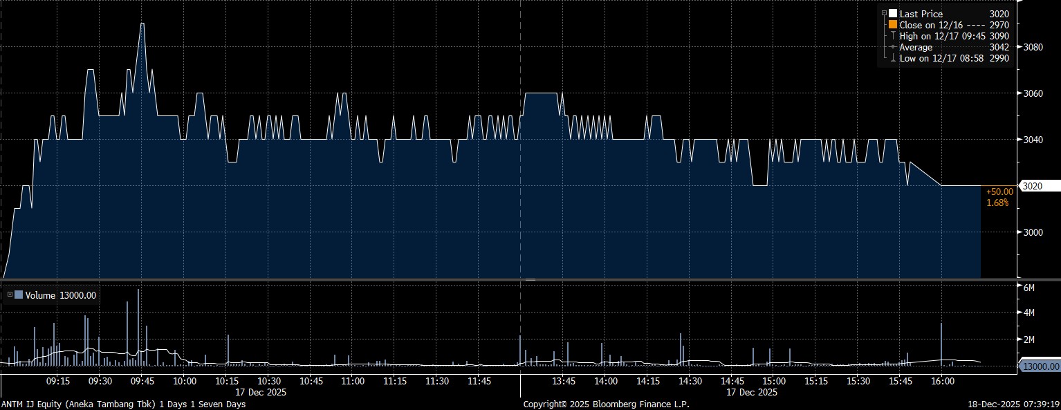 Sedang pada kesempatan yang sama, investor asing mencatat net buy terbesar pada saham PT Aneka Tambang Tbk (ANTM) mencapai Rp111,95 miliar. Terdorong pembelian yang deras, saham ANTM menguat 1,68% dan ditutup di posisi Rp3.020/saham.