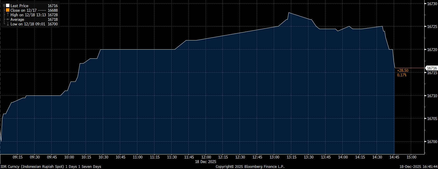 Rupiah spot ditutup kehilangan nilai 0,17% ke level Rp16.716/US$. Rupiah JISDOR Bank Indonesia juga ditutup melemah mencapai Rp16.722/US$ yang merupakan level terendah dalam hampir satu bulan.
