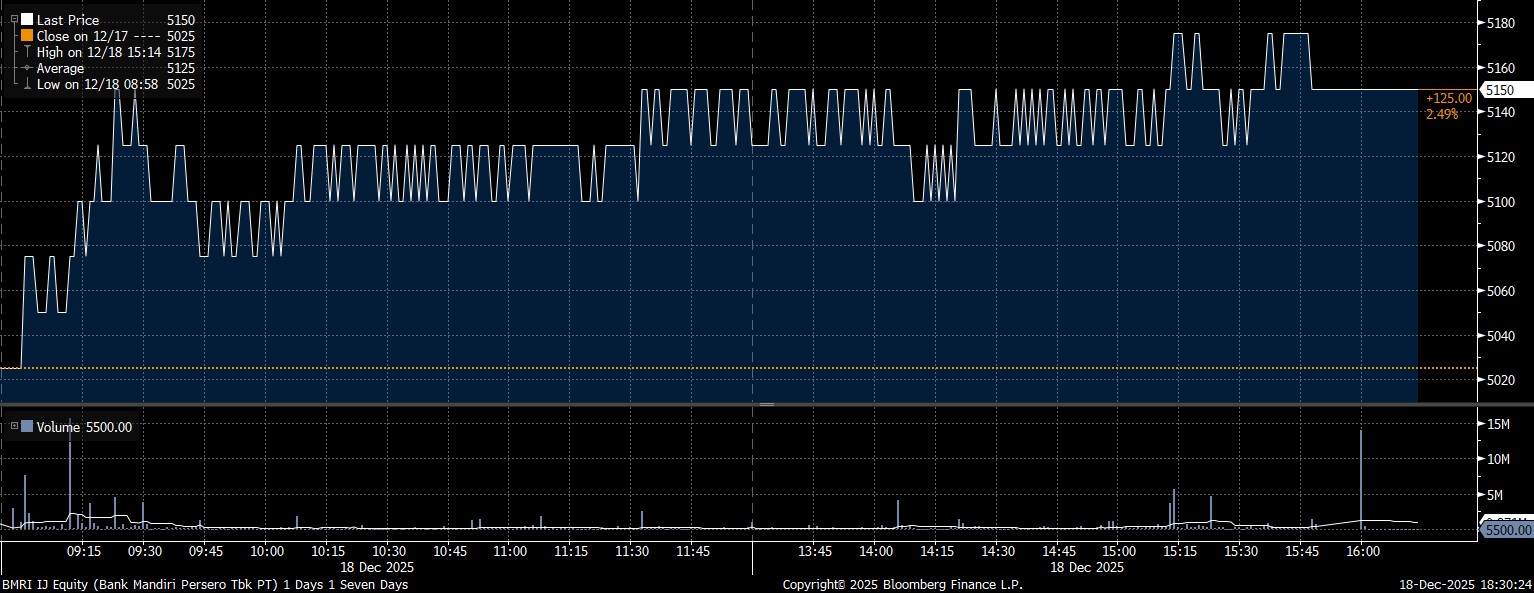 - Bank Mandiri (BMRI) menguat 2,49% ke Rp5.150/saham