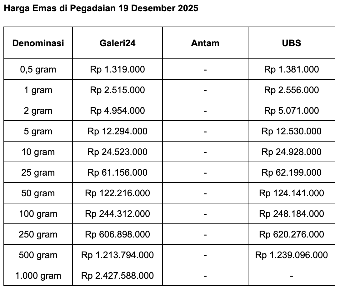 Adapun untuk ukuran 1 gram, harga emas Galeri 24 di Pegadaian adalah Rp 2.515.000. Terangkat Rp 11.000 ketimbang harga kemarin.