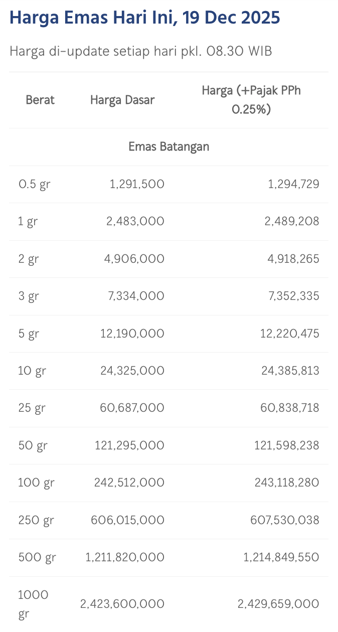 Pada Jumat (19/12/2025), emas Antam dihargai Rp 2.483.000/gram. Melemah Rp 4.000 dari harga hari sebelumnya.
