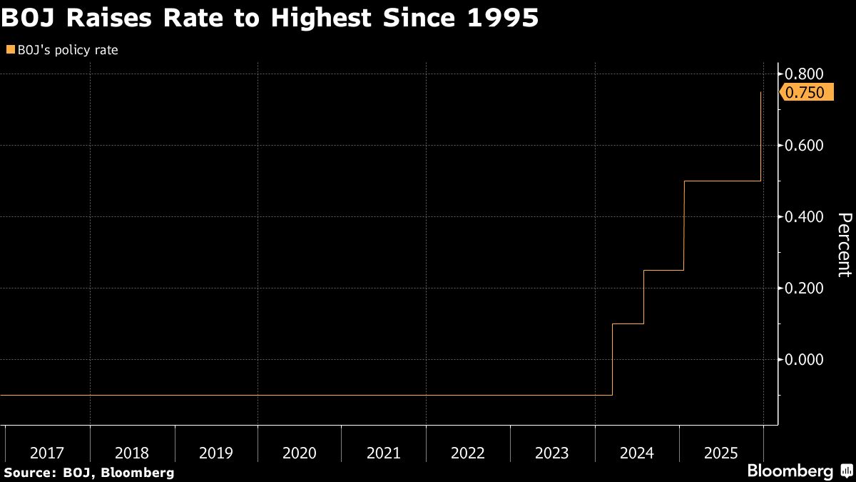 Dewan kebijakan yang dipimpin Gubernur Kazuo Ueda menaikkan suku bunga sebesar seperempat poin persentase menjadi 0,75% dalam keputusan bulat, demikian pernyataan BOJ pada Jumat (19/12). Bank sentral menilai peluang terealisasinya prospek ekonomi mereka semakin besar. Kenaikan suku bunga ini telah diperkirakan oleh seluruh 50 ekonom yang disurvei Bloomberg.