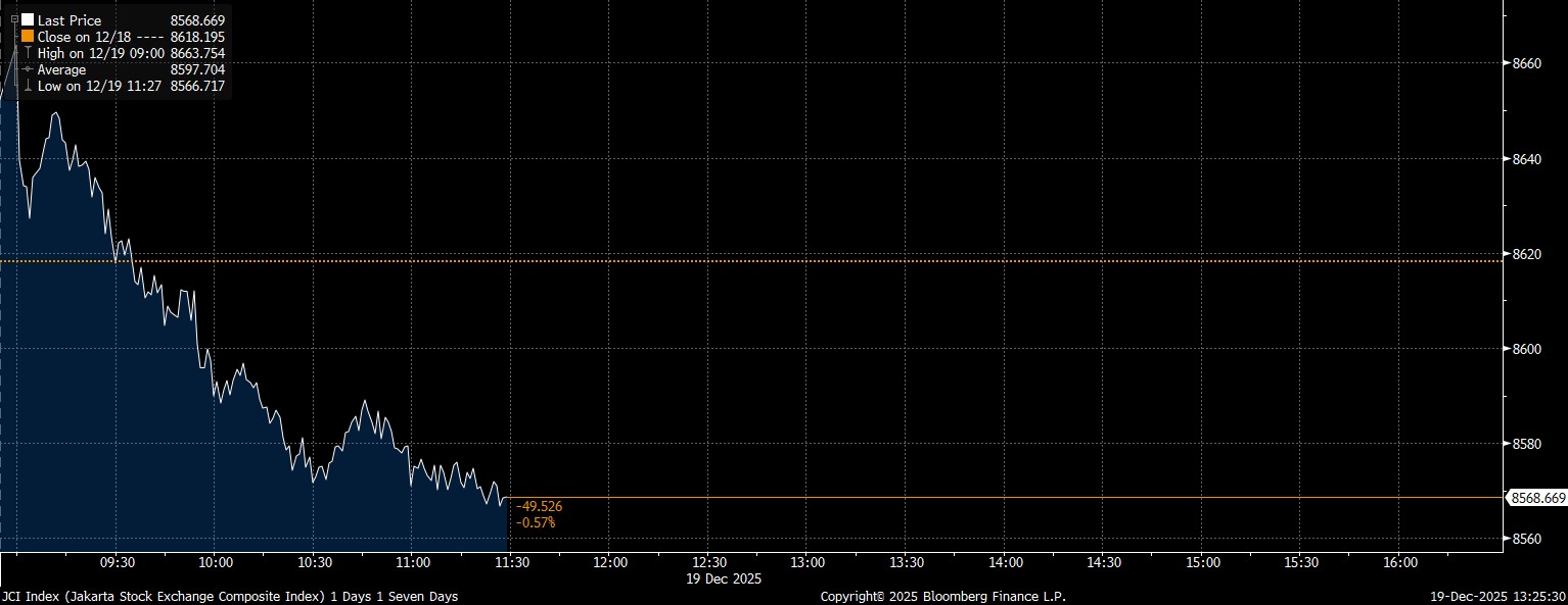 Bloomberg Technoz, Jakarta - Indeks Harga Saham Gabungan (IHSG) menutup perdagangan Sesi I di zona merah. IHSG melemah 0,57% ke level 8.568,66 pada Jumat (19/12/2025). Saham Surya Citra Media (SCMA), saham PT Vale Indonesia Tbk (INCO), hingga saham PT Elang Mahkota Teknologi Tbk (EMTK) jadi pemberat.