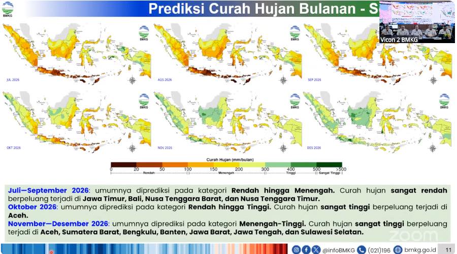 Juli-September 2026: umumnya diprediksi pada kategori rendah hingga menengah. Curah hujan sangat rendah berpeluang terjadi di Jawa Timur, Bali, Nusa Tenggara Barat (NTB) dan NTT.