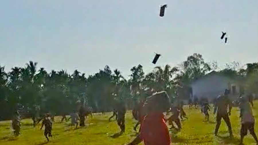 Masyarakat dari berbagai usia, mulai dari anak-anak, orang tua, hingga lansia, berteriak bahagia menyambut bantuan yang jatuh perlahan dari udara. Anak-anak berlarian dengan tawa lepas, mengikuti arah helibox yang mendarat satu per satu di lapangan. Begitu menyentuh tanah, warga segera mengerubungi kotak-kotak tersebut, merayakan kedatangan bantuan.