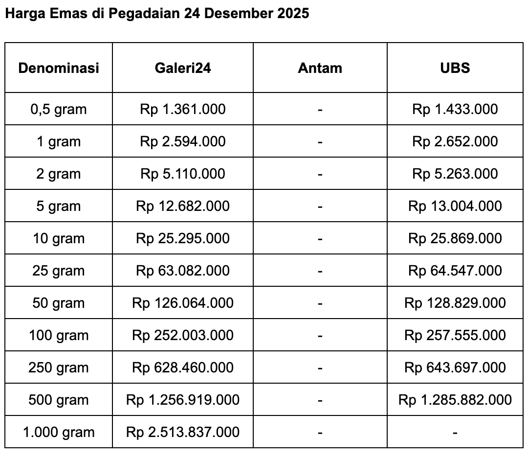 Lalu untuk emas batangan Galeri 24 ukuran 0,5 gram, Pegadaian menjual di harga Rp 1.361.000. Bertambah Rp 30.000 dalam sehari,