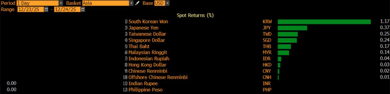 Tidak ada mata uang Asia yang merah pagi ini. Rupee India dan peso Filipina menjadi yang terlemah, itu pun stagnan saja, tidak sampai terdepresiasi.