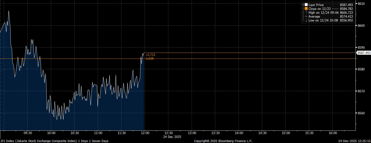 Bloomberg Technoz, Jakarta - Indeks Harga Saham Gabungan (IHSG) ditutup menguat 0,03% di level 8.587,49 pada jeda Sesi I Rabu (24/12/2025) usai bergerak fluktuatif sejak pembukaan pagi hari tadi menjelang Libur Natal.