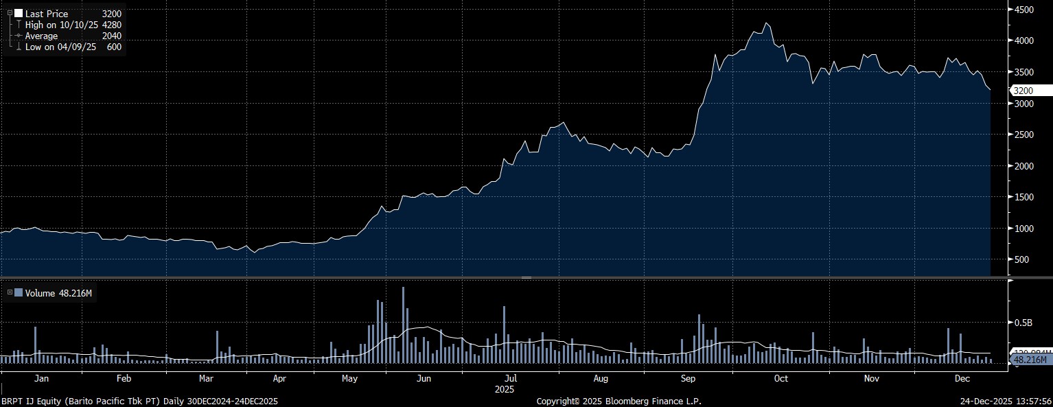 Saham PT Barito Pacific Tbk (BRPT) milik Prajogo Pangestu, misalnya. Berdasarkan data Bloomberg, Rabu (24/12/2025) jelang penutupan perdagangan tahun, saham BRPT berhasil melesat mencapai 246,74% point–to–point.