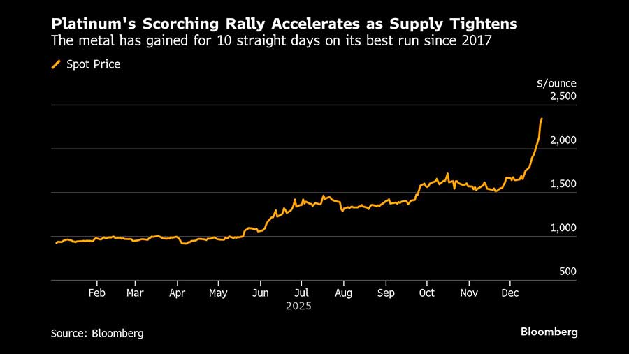 Platinum tercatat naik 4% pada perdagangan Rabu untuk melampaui US$2.300/ons untuk pertama kalinya sejak Bloomberg mulai mengumpulkan data pada 1987. Didorong oleh pasokan yang ketat dan biaya pinjaman yang historis tinggi, logam yang digunakan dalam sektor otomotif dan perhiasan ini naik untuk sesi ke-10 berturut-turut, rekor kemenangan terpanjang sejak 2017.