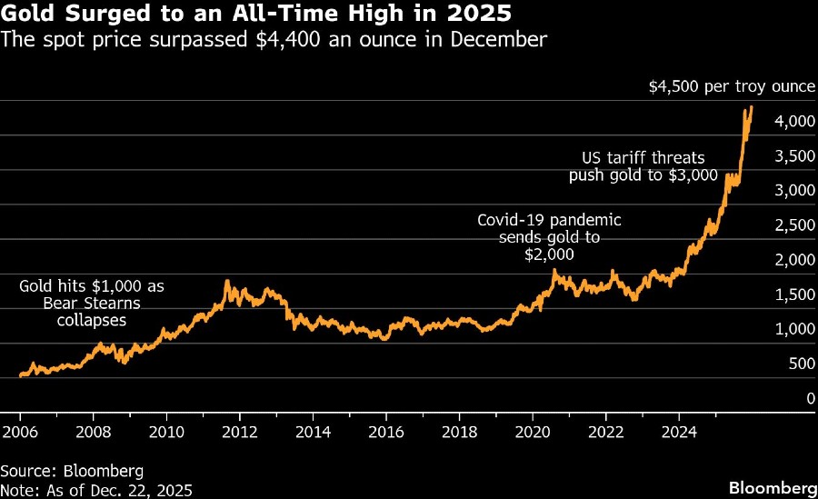 Hal ini mendorong logam mulia tersebut mencatatkan serangkaian rekor harga dan melampaui puncak inflasi-disesuaikan dari tahun 1980. Ada penurunan harga yang signifikan pada Oktober di tengah kekhawatiran bahwa reli sudah ‘overdosis’. Namun, momentum cepat pulih seiring ekspektasi pemotongan suku bunga AS lebih lanjut, dan emas menembus US$4.400/troy ounce pada akhir tahun untuk mencapai rekor tertinggi sepanjang masa.