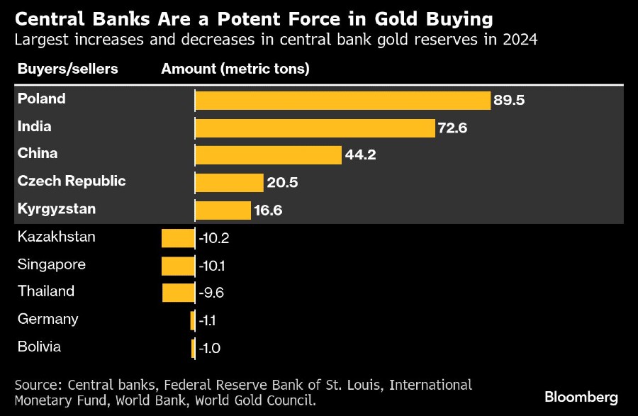 Kenaikan harga emas yang tajam sejak awal 2024 sebagian didorong oleh pembelian besar-besaran oleh bank sentral, terutama di pasar emerging markets yang berusaha mengurangi ketergantungan mereka pada dolar AS, mata uang cadangan utama dunia.