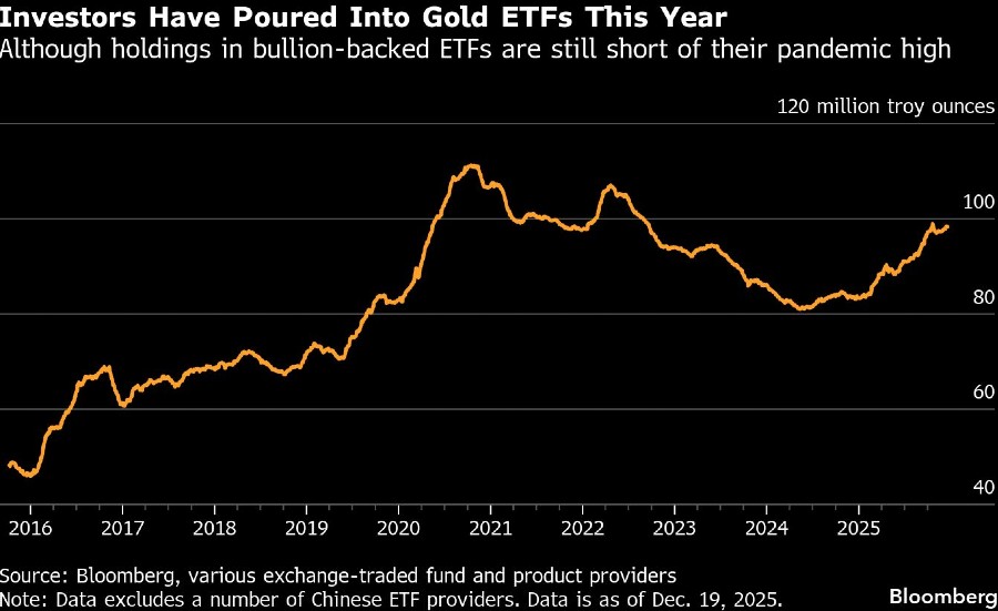 Investor juga dapat memilih untuk merealisasikan keuntungan mereka, meskipun minat mereka terhadap logam mulia ini mungkin belum mencapai batasnya. Total kepemilikan ETF emas masih jauh dari puncaknya pada 2020.