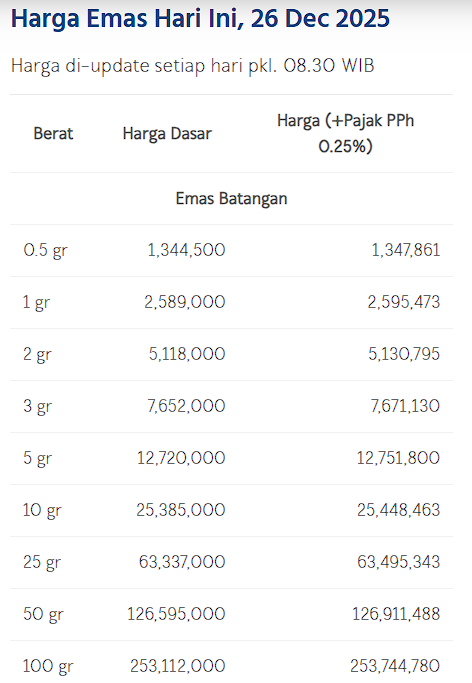 Pada Jumat (26/12/2025), yang bertepatan dengan cuti bersama Hari Natal, emas Antam dihargai Rp 2.589.000/gram. Bertambah mahal Rp 13.000 dibanding harga perdagangan hari sebelumnya.