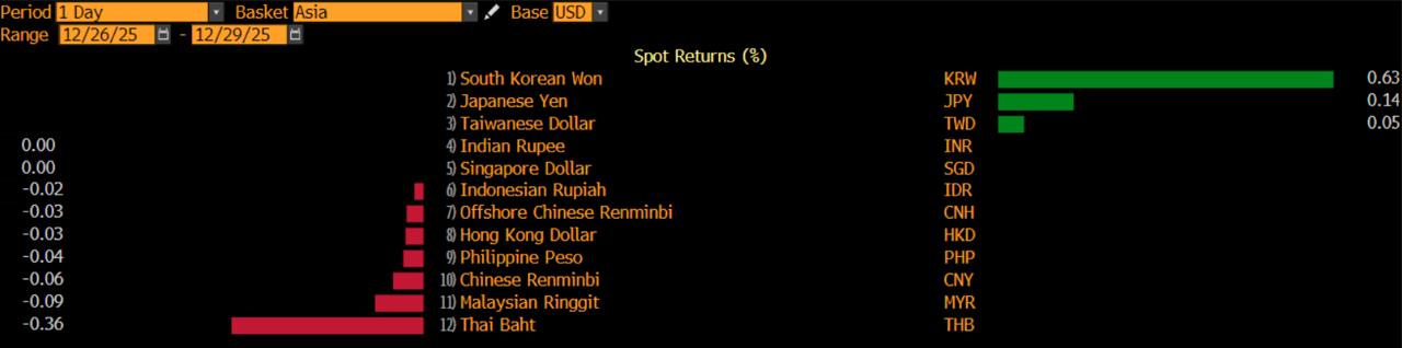 Di zona merah. baht Thailand menjadi yang terlemah di Benua Kuning dengan depresiasi 0,36%. Disusul oleh ringgit Malaysia (-0,09%), yuan China (-0,06%), dan peso Filipina (-0,04%).