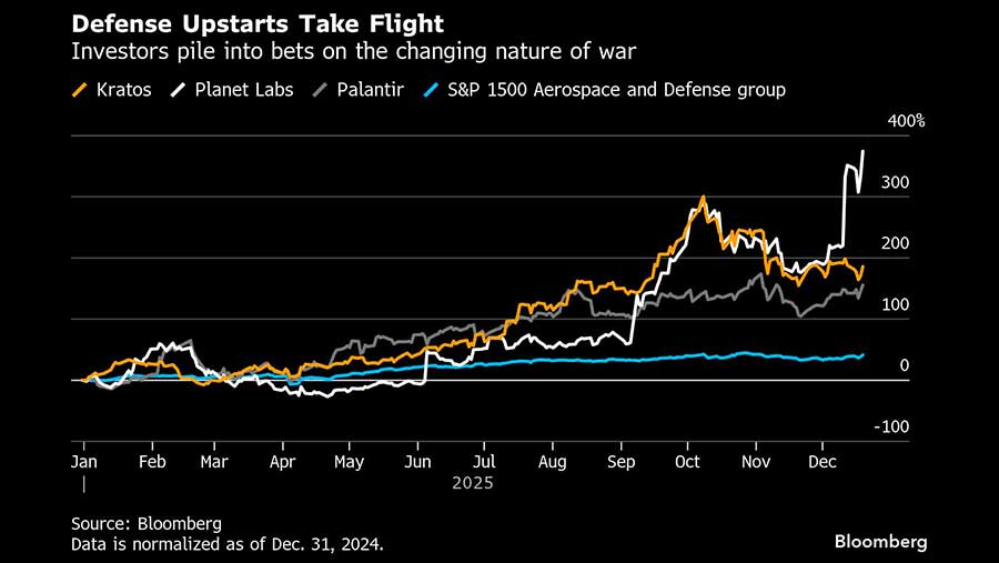Pendatang baru di puncak ‘klasemen’— dalam hal kenaikan harga saham, meski belum dalam valuasi pasar — termasuk pembuat drone Kratos Defense & Security Solutions Inc., perusahaan intelijen satelit Planet Labs PBC, dan perusahaan analitik data Palantir Technologies Inc. Setiap sahham perusahaan yang dimaksud setidaknya sudah naik dua kali lipat tahun ini. AeroVironment Inc. dan BlackSky Technology Inc. juga menawarkan imbal hasil yang kuat.