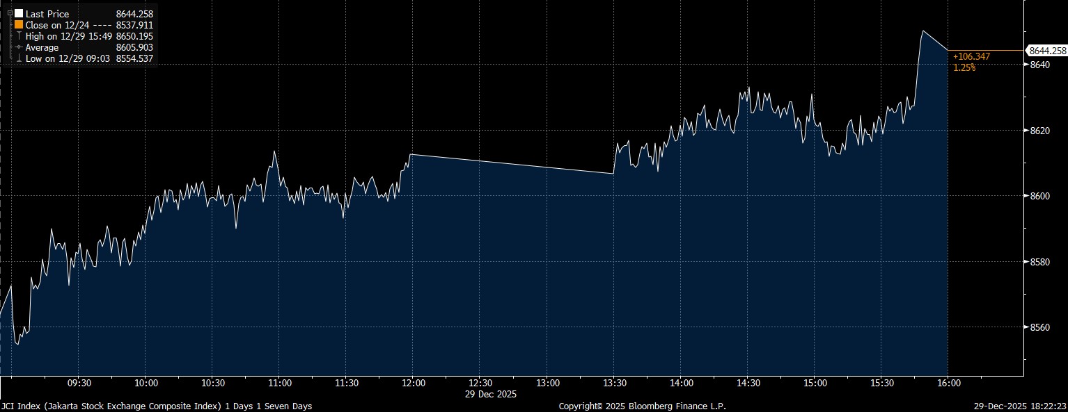 Pada Senin (29/12/2025), IHSG ditutup di posisi 8.644,25 pada penutupan perdagangan. Naik 1,25% dibanding dengan hari sebelumnya.