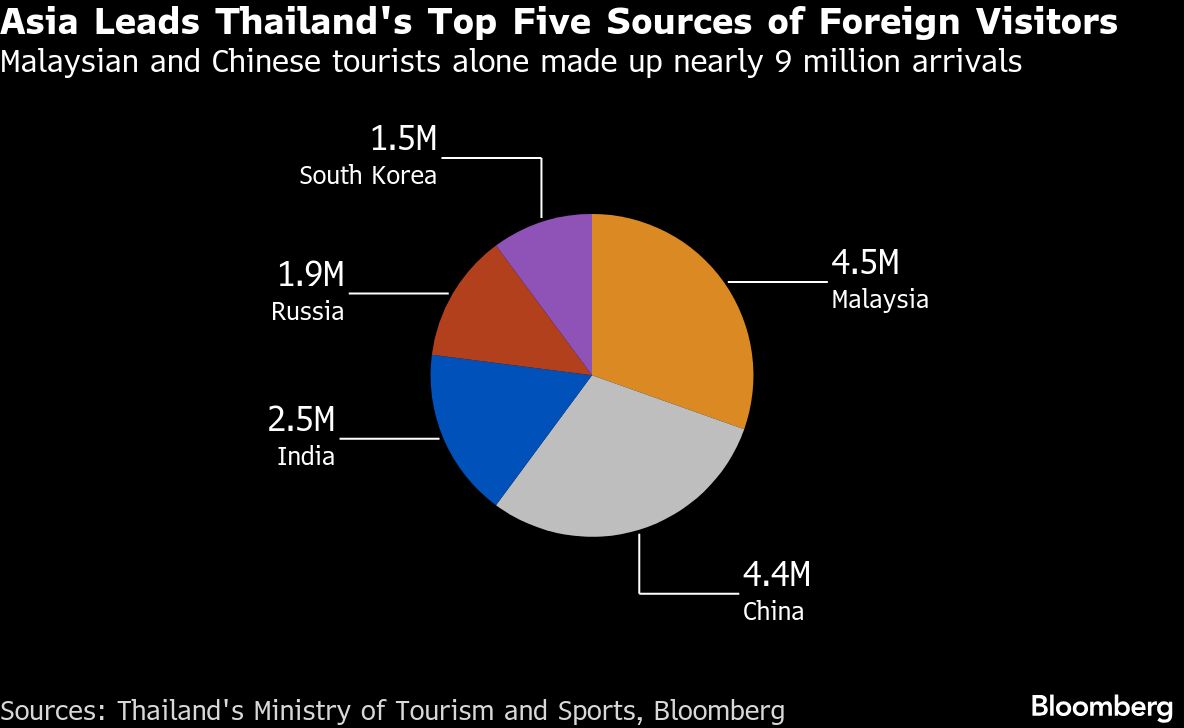 Warga Malaysia menempati urutan teratas wisatawan asing dengan 4,5 juta orang, diikuti 4,4 juta wisatawan China dan 2,5 juta pelancong dari India, menurut data Kementerian Pariwisata dan Olahraga. Pendapatan pariwisata dari kedatangan internasional mencapai total 1,5 triliun baht hingga 28 Desember.