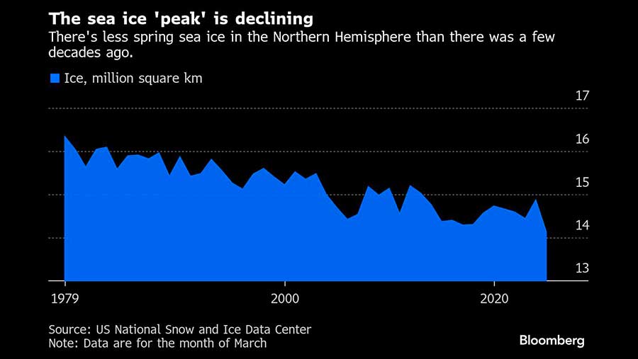 - Puncak cakupan es laut tahunan pada Maret merupakan yang terkecil dalam 47 tahun catatan satelit, sementara cakupan es laut musim panas 28% lebih kecil dibandingkan dua dekade lalu.