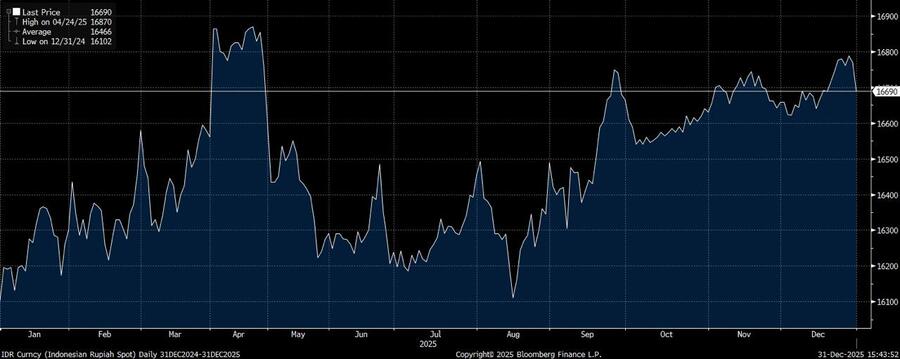 Sementara, sepanjang tahun nilai tukar rupiah cenderung melorot dari posisi Rp16.102/US$ pada penutupan tahun 2024, hingga posisi penutupan akhir tahun 2025 di posisi Rp16.690/US$. Capaian ini membuat rupiah menjadi mata uang terlemah kedua di Asia sepanjang 2025.