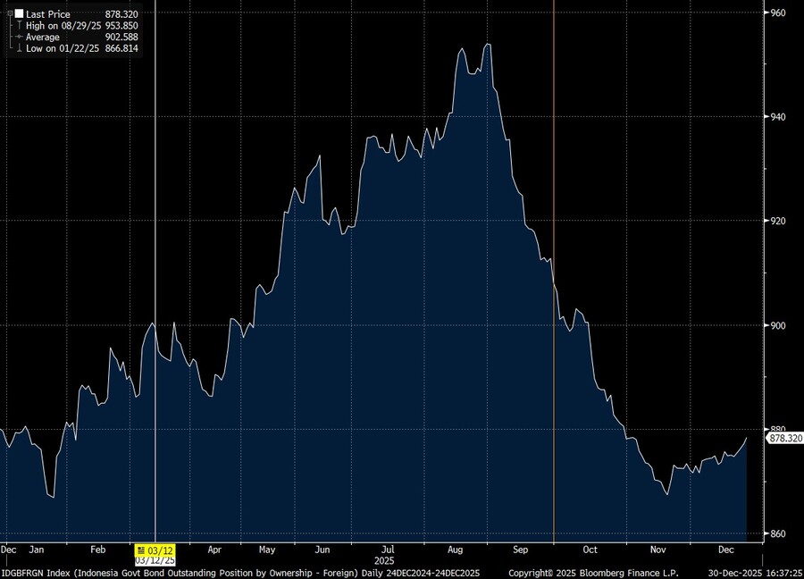 Di saat yang sama, tantangan juga datang dari pasar surat utang. Melansir data Bloomberg menunjukkan bahwa kepemilikan asing di pasar Surat Berharga Negara (SBN) menunjukkan tren penurunan sepanjang 2025. Keluarnya dana asing dari pasar Indonesia tak lepas dari kekhawatiran pasar terkait beberapa kebijakan fiskal yang cenderung kontroversial, termasuk mengedepankan anggaran setara 14% dari Produk Domestik Bruto (PDB) untuk program populis, Makan Bergizi Gratis (MBG).