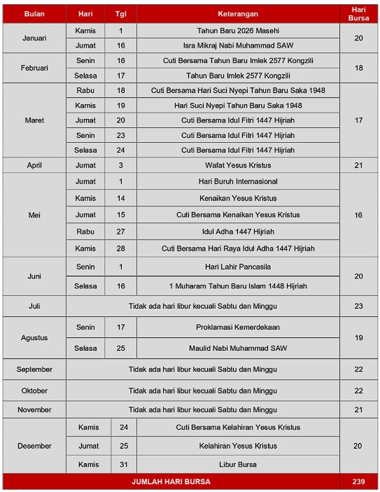 Bloomberg Technoz, Jakarta - Bursa Efek Indonesia (BEI) telah menetapkan jadwal libur bursa perode 2026. Total, ada 239 hari bursa sepanjang tahun ini.