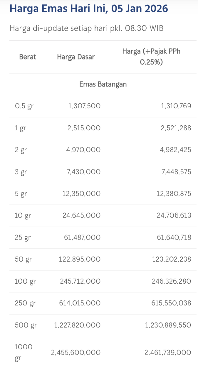 Pada Senin (52/1/2026), emas Antam dihargai Rp 2.515.000/gram. Naik Rp 27.000 dari posisi perdagangan terakhir 3 Januari.