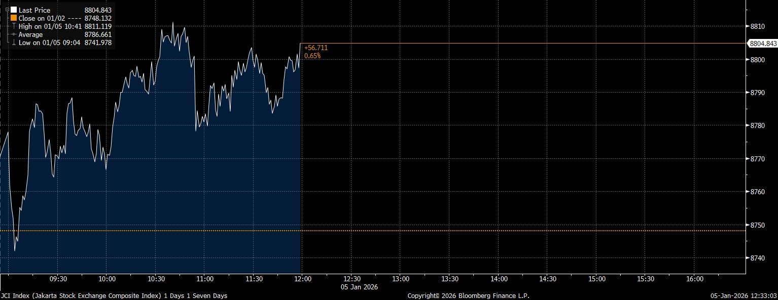 Bloomberg Technoz, Jakarta - Indeks Harga Saham Gabungan (IHSG) berhasil mencetak rekor tertinggi baru sepanjang masa atau All Time High (ATH). Pada perdagangan Sesi I Senin (5/1/2026), IHSG ditutup menguat 0,65% di posisi 8.804,84 yang merupakan level harga tertinggi penutupan.