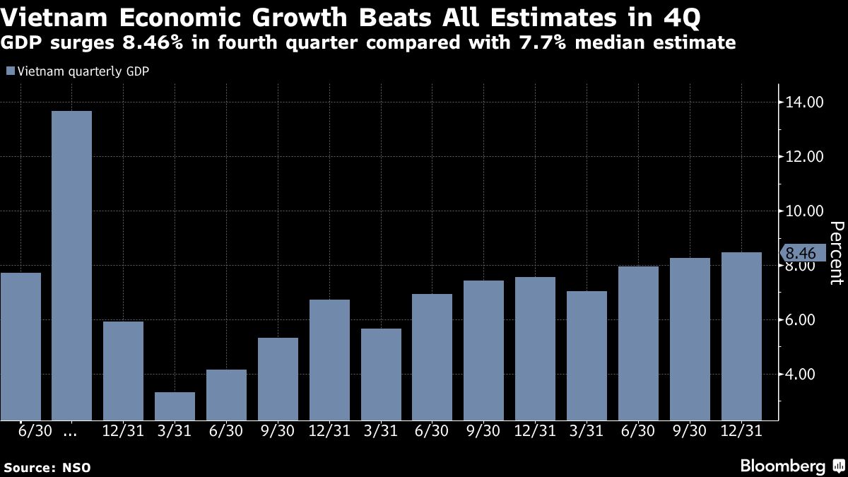 Berdasarkan data dari Kantor Statistik Nasional di Hanoi yang dirilis Senin (5/1), Produk Domestik Bruto (PDB) Vietnam berekspansi sebesar 8,46% pada periode Oktober-Desember dibandingkan tahun sebelumnya. Angka ini melampaui semua estimasi dalam survei Bloomberg yang mematok angka median di level 7,7%.