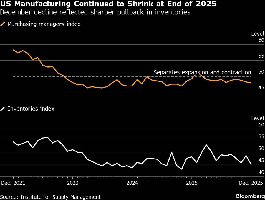 Bloomberg, Aktivitas manufaktur AS menyusut pada Desember dengan laju terlemah sejak 2024, mengakhiri tahun yang sulit bagi pabrik-pabrik Amerika.