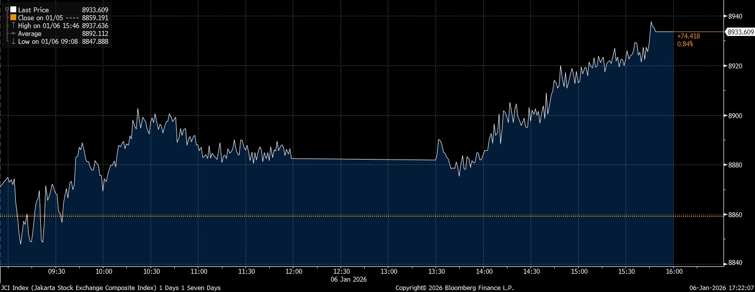 Bloomberg Technoz, Jakarta - Indeks Harga Saham Gabungan (IHSG) berhasil menutup perdagangan hari ini, Selasa (6/1/2026), di zona harga tertinggi sepanjang masa (All Time High/ATH) dengan penguatan yang optimistis. IHSG ditutup menguat 0,84% di posisi 8.933,6.
