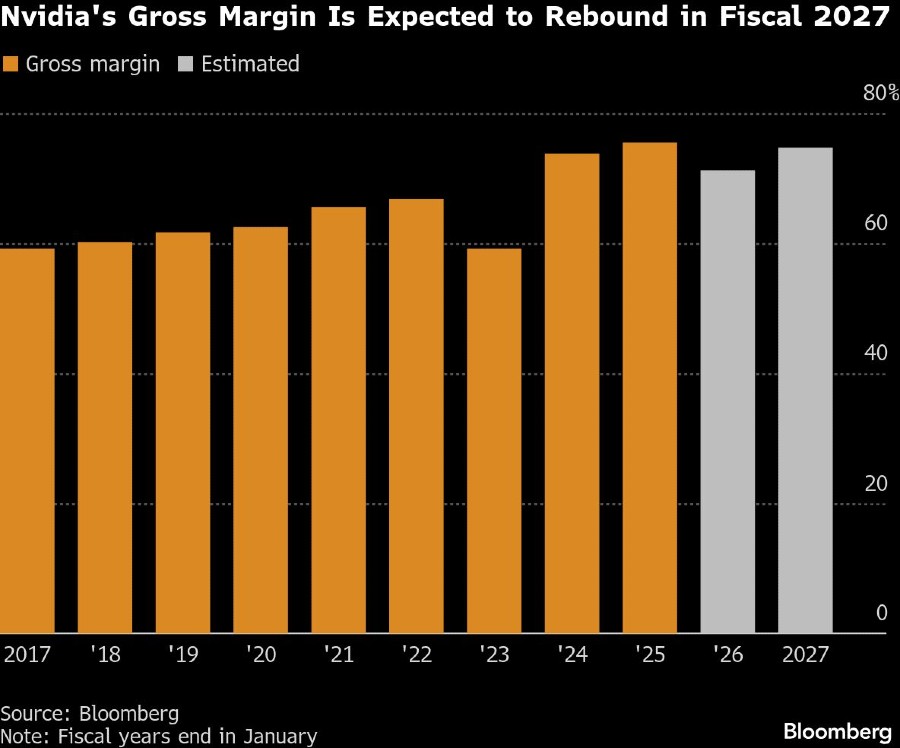 Margin kotor produsen chip, sebuah indikator utama profitabilitas yang tidak termasuk biaya barang yang dijual, berada di kisaran 70% pada tahun fiskal 2024 dan 2025. Namun, margin tersebut turun pada tahun fiskal 2026 akibat biaya yang lebih tinggi dari peningkatan produksi chip seri Blackwell.