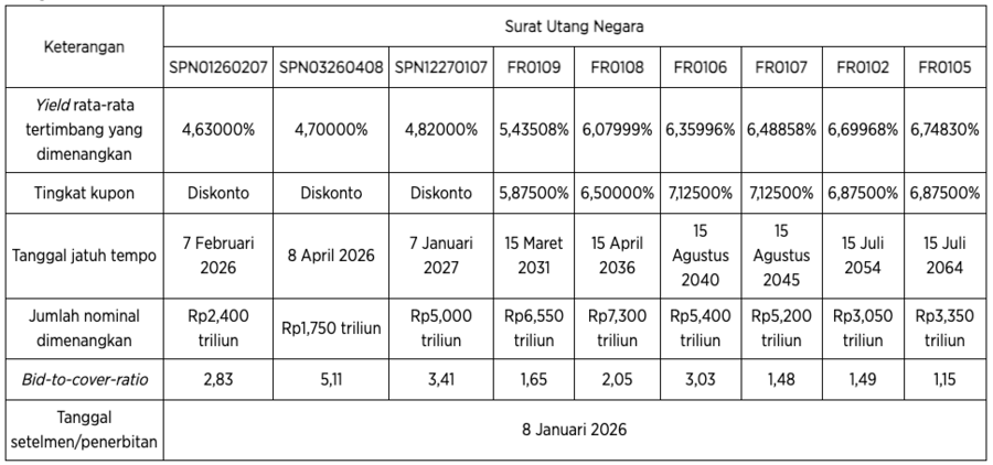 Minat pasar terhadap lelang awal tahun ini terlihat lebih tinggi daripada lelang terakhir 2025 pada 16 Desember lalu. Nilai permintaan yang masuk mencapai Rp90,96 triliun, naik 26,75% daripada incoming bids lelang SUN sebelumnya.